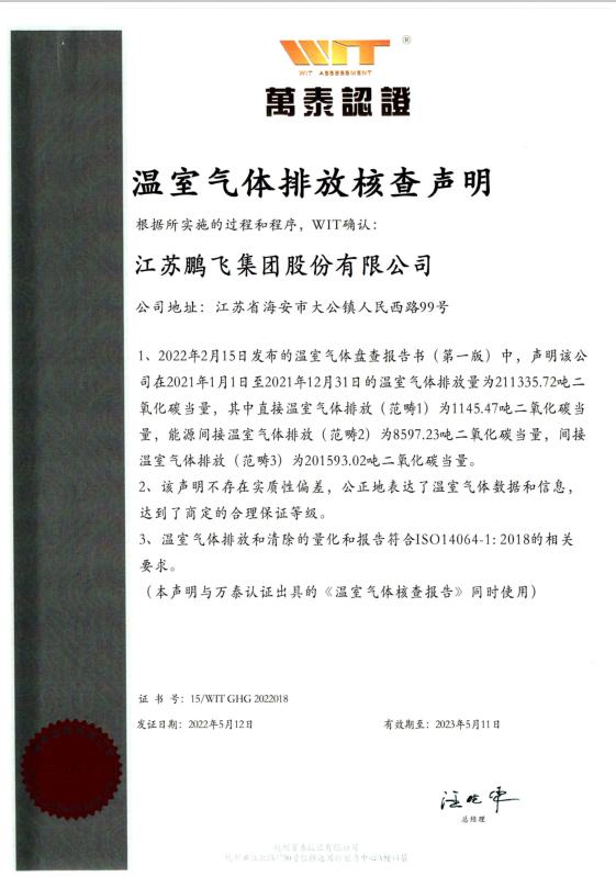 江蘇鵬飛集團股份有限公司一直以來堅持綠色采購,綠色生產,綠色物流的原則,積極響應并參與相關方(政府、客戶等)節能降排、碳排放報告活動。