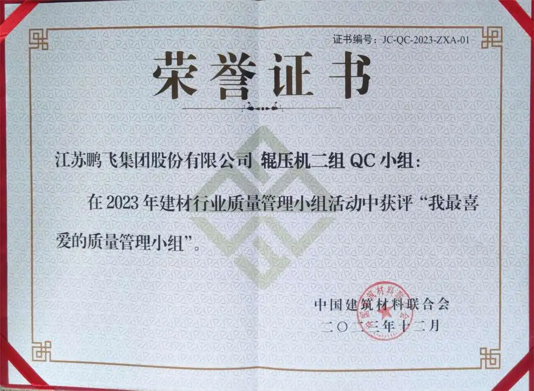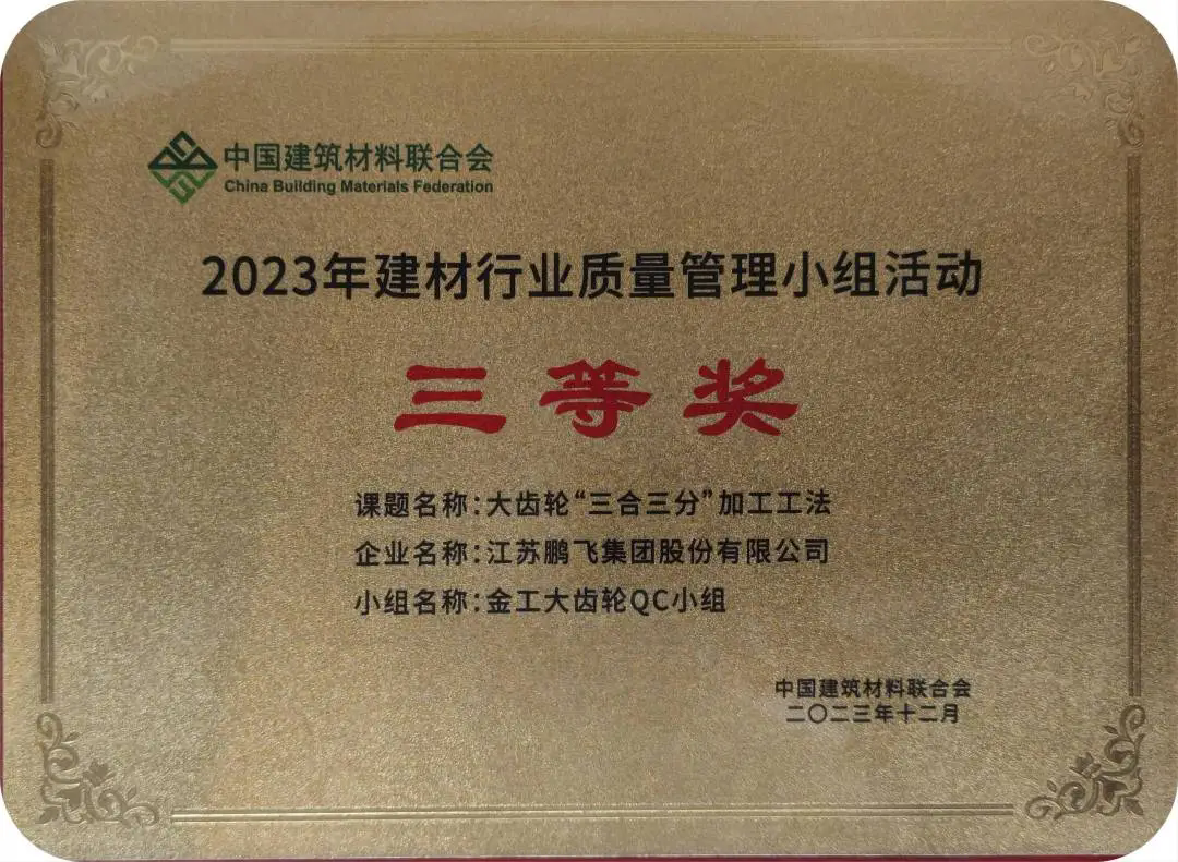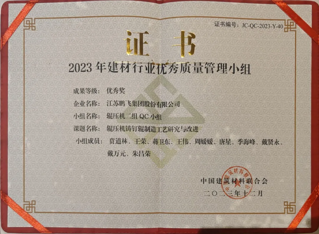 近期,中國建筑材料聯合會組織召開第三十九次建材行業質量管理小組代表大會暨質量信得過班組經驗交流大會,會上頒發了2023年建材行業優秀質量管理小組和質量信得過班組、先進個人和優秀組織榮譽證書。鵬飛金工大齒輪“三合三分”加工工法獲得“2023年建材行業優秀質量管理小組三等獎”;輥壓機二組QC小組的輥壓機鑄釘輥制造工藝研究與改進獲得“2023年建材行業優秀質量管理小組優秀獎”,同時QC小組獲評“我最喜愛的質量管理小組”。