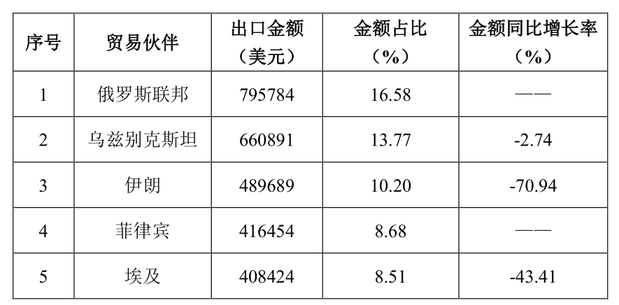 表1 2021年水泥回轉窯出口數量、金額及增長率