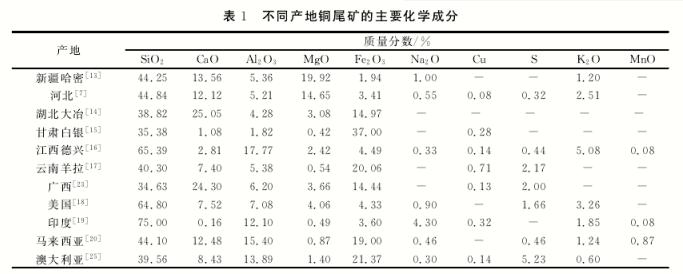 銅尾礦的化學(xué)組成非常復(fù)雜,不同產(chǎn)地的銅尾礦之間可比較性差,這是銅礦石成礦地質(zhì)、礦石開采方法、選礦工藝以及銅尾礦堆存方式等差異所致。組成銅尾礦的主要元素有 Mg、Al、Si、S、Ca、Fe、Cu 等,且 伴 有 Mn、Ti、Zn、Sr等 微 量 元素。不同產(chǎn)地銅尾礦的主要化學(xué)成分見表1。