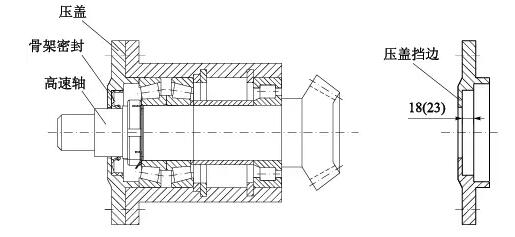 骨架密封厚度15mm,拆下壓蓋用車床將骨架密封擋邊車薄5mm,壓蓋密封槽深度由18mm加深到23mm(見圖4)。此法使得骨架密封在高速軸上的安裝位置向外移動(dòng)5mm,避開高速軸上的溝槽。經(jīng)此處理,解決了漏油問題,可以正常生產(chǎn),等到計(jì)劃?rùn)z修停機(jī)時(shí),再?gòu)氐滋幚砀咚佥S上的溝槽。