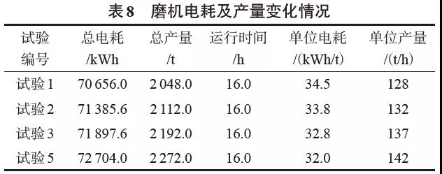 5 效益分析試驗過程中粉磨系統的電耗及產量變化見表8。