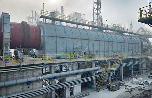 轉化焙燒:鋰輝石精礦從精礦庫人工送至斗式提升機提升至精礦倉,再經圓盤給料機和螺旋給料機加入碳酸鋰回轉窯窯尾,利用窯尾預熱段高溫氣體干燥精礦,精礦在煅燒段約1200℃左右的溫度下進行晶型轉化焙燒,由α型(單斜晶系,密度3150kg/m3)轉化為β型鋰輝石(四方晶系,密度2400kg/m3,即焙料),轉化率約98%。